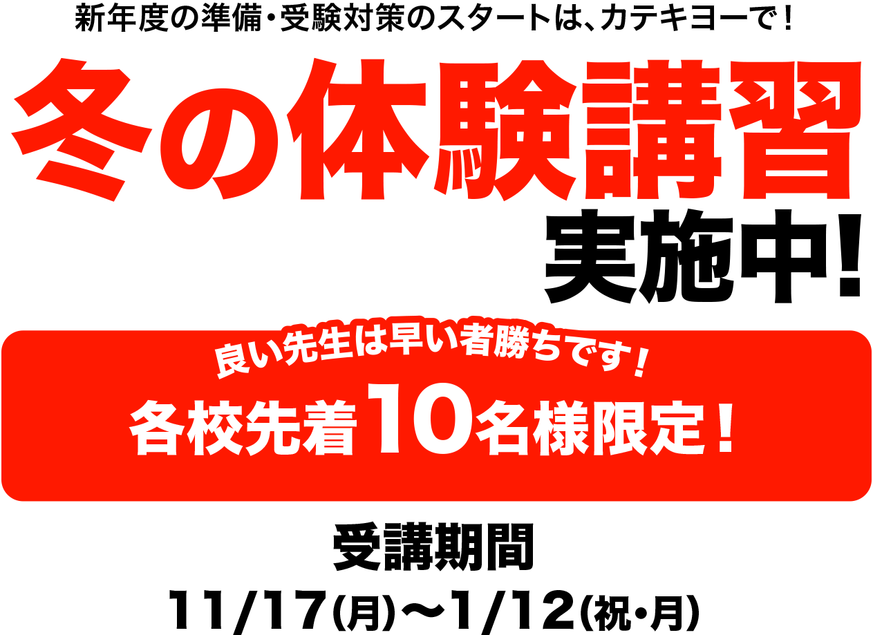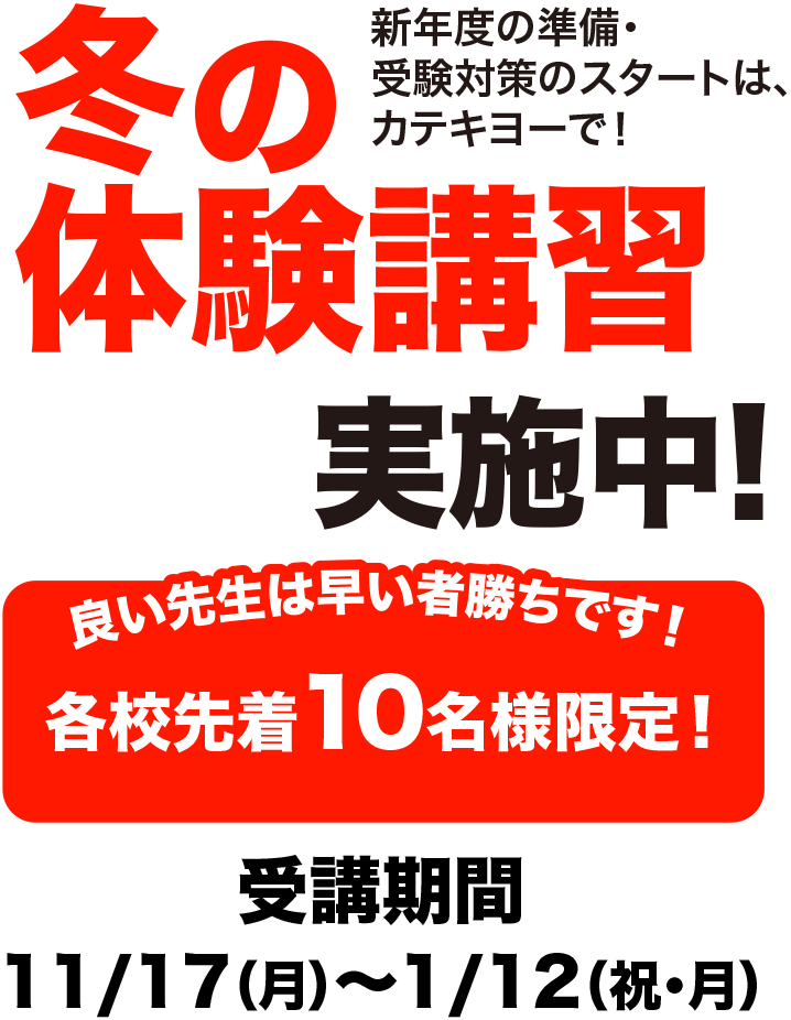 高校入試まで残すところあと3か月あまり。不安な科目、単元が原因で志望校を安易に下げようと思っていませんか。カテキヨーならまだまだやれることがあります。苦手単元を1対1指導で丁寧に解説し、1つずつ解決していきます。入試直前には実戦演習を重ねることで得点力向上を図っていきます。